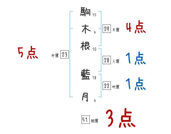天運![]() | 駒木根藍月さんの天運は29画の4つ星!完全主義で才能がある。厳格な心の持ち主。 家系が持つ宿命的な運勢を表します。祖先から受け継いだ苗字ですので自分の力が及びません。家柄を象徴します。 |