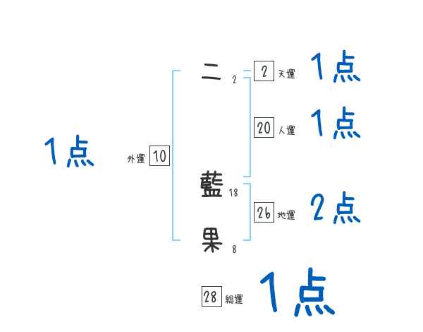 総運![]() | 二藍果さんの総運は28画の1つ星!家庭環境に注意。スポーツで活躍できる能力があるかも。 あなたの人生を表す1番重要な運勢です。生涯を通じて影響する総合運となり、主に50歳以降の晩年期に影響を及ぼします。 |