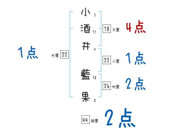 天運![]() | 小酒井藍果さんの天運は18画の4つ星!情熱的で剛気。忍耐力があり信頼される。 家系が持つ宿命的な運勢を表します。祖先から受け継いだ苗字ですので自分の力が及びません。家柄を象徴します。 |