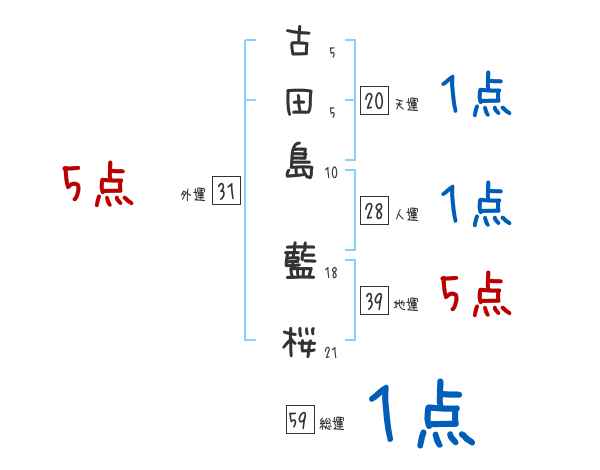 総運![]() | 古田島藍桜さんの総運は59画の1つ星!意志の弱さであきらめることが多いかも。粘り強さが必要。 あなたの人生を表す1番重要な運勢です。生涯を通じて影響する総合運となり、主に50歳以降の晩年期に影響を及ぼします。 |