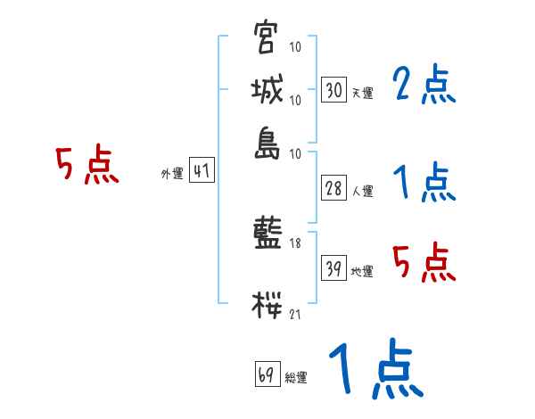 天運![]() | 宮城島藍桜さんの天運は30画の2つ星!浮き沈みの激しさに注意しましょう。 家系が持つ宿命的な運勢を表します。祖先から受け継いだ苗字ですので自分の力が及びません。家柄を象徴します。 |