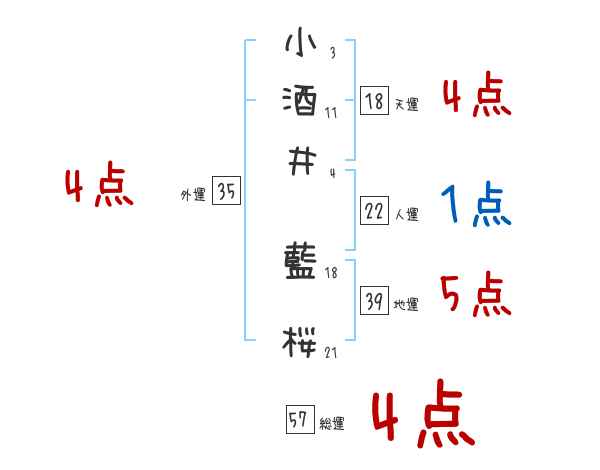 外運![]() | 小酒井藍桜さんの外運は35画の4つ星!温厚な性格で感受性が高い。穏和な性格で人望が厚い。 生活面を象徴する運勢です。外部から受ける影響力を表し、結婚運、家庭運や職場、環境への順応性を表します。 |
