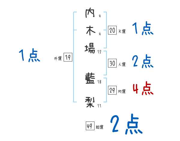 外運![]() | 内木場藍梨さんの外運は19画の1つ星!優れた才能を持ちますが、協調性が足りないことも。周りの人と協力する事を意識しましょう。 生活面を象徴する運勢です。外部から受ける影響力を表し、結婚運、家庭運や職場、環境への順応性を表します。 |