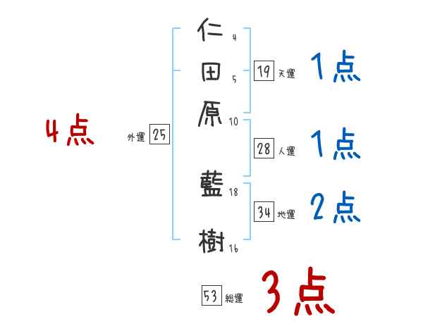 人運![]() | 仁田原藍樹さんの人運は28画の1つ星!家庭環境に注意。スポーツで活躍できる能力があるかも。 性格や才能などを表す2番目に重要な運勢です。人間関係や協調性、社会的な成功に影響します。主に20歳から50歳ぐらいまでの中年期の運勢を表します。 |