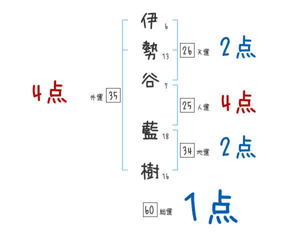 天運![]() | 伊勢谷藍樹さんの天運は26画の2つ星!波瀾万丈かも。信頼できる人を大事にしましょう。 家系が持つ宿命的な運勢を表します。祖先から受け継いだ苗字ですので自分の力が及びません。家柄を象徴します。 |