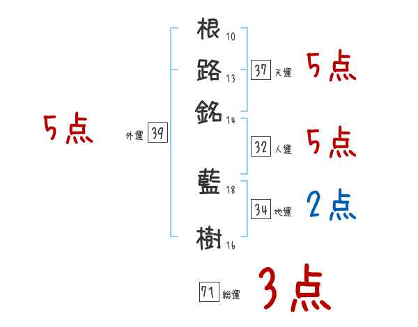 外運![]() | 根路銘藍樹さんの外運は39画の5つ星!社交性に優れ人望が厚い。人の上に立ち成功する。 生活面を象徴する運勢です。外部から受ける影響力を表し、結婚運、家庭運や職場、環境への順応性を表します。 |