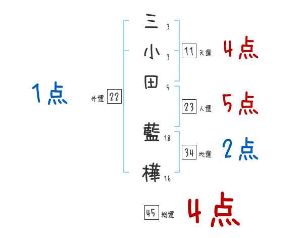 天運![]() | 三小田藍樺さんの天運は11画の4つ星!着実に富や地位を得る幸運な人生。 家系が持つ宿命的な運勢を表します。祖先から受け継いだ苗字ですので自分の力が及びません。家柄を象徴します。 |