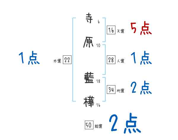 天運![]() | 寺原藍樺さんの天運は16画の5つ星!人望が厚く大きく発展する。逆転成功が見える。 家系が持つ宿命的な運勢を表します。祖先から受け継いだ苗字ですので自分の力が及びません。家柄を象徴します。 |