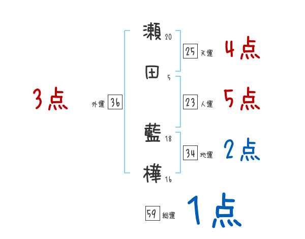 天運![]() | 瀬田藍樺さんの天運は25画の4つ星!個性があり才能があふれる。強運の持ち主で発展する。 家系が持つ宿命的な運勢を表します。祖先から受け継いだ苗字ですので自分の力が及びません。家柄を象徴します。 |