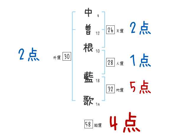 外運![]() | 中曽根藍歌さんの外運は30画の2つ星!浮き沈みの激しさに注意しましょう。 生活面を象徴する運勢です。外部から受ける影響力を表し、結婚運、家庭運や職場、環境への順応性を表します。 |