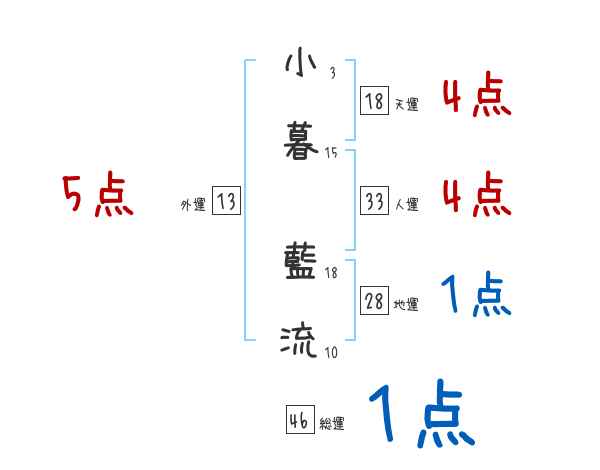 天運![]() | 小暮藍流さんの天運は18画の4つ星!情熱的で剛気。忍耐力があり信頼される。 家系が持つ宿命的な運勢を表します。祖先から受け継いだ苗字ですので自分の力が及びません。家柄を象徴します。 |