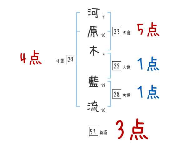 天運![]() | 河原木藍流さんの天運は23画の5つ星!想像力に優れ活力がある。一代で成功し名誉を手に入れる。 家系が持つ宿命的な運勢を表します。祖先から受け継いだ苗字ですので自分の力が及びません。家柄を象徴します。 |