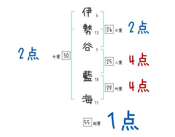 天運![]() | 伊勢谷藍海さんの天運は26画の2つ星!波瀾万丈かも。信頼できる人を大事にしましょう。 家系が持つ宿命的な運勢を表します。祖先から受け継いだ苗字ですので自分の力が及びません。家柄を象徴します。 |