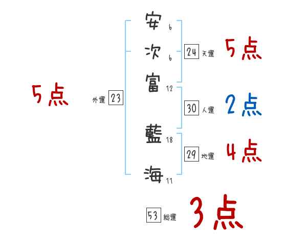 総運![]() | 安次富藍海さんの総運は53画の3つ星!やや見栄っ張りで虚栄心がある。散財に注意。 あなたの人生を表す1番重要な運勢です。生涯を通じて影響する総合運となり、主に50歳以降の晩年期に影響を及ぼします。 |