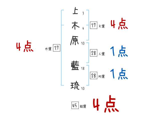 外運![]() | 上木原藍琉さんの外運は17画の4つ星!積極的な行動力。地位を気づき財産を手に入れる。純粋な心と直感力。 生活面を象徴する運勢です。外部から受ける影響力を表し、結婚運、家庭運や職場、環境への順応性を表します。 |