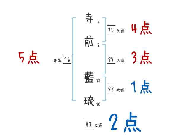 外運![]() | 寺前藍琉さんの外運は16画の5つ星!人望が厚く大きく発展する。逆転成功が見える。 生活面を象徴する運勢です。外部から受ける影響力を表し、結婚運、家庭運や職場、環境への順応性を表します。 |