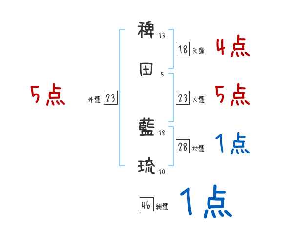 天運![]() | 稗田藍琉さんの天運は18画の4つ星!情熱的で剛気。忍耐力があり信頼される。 家系が持つ宿命的な運勢を表します。祖先から受け継いだ苗字ですので自分の力が及びません。家柄を象徴します。 |