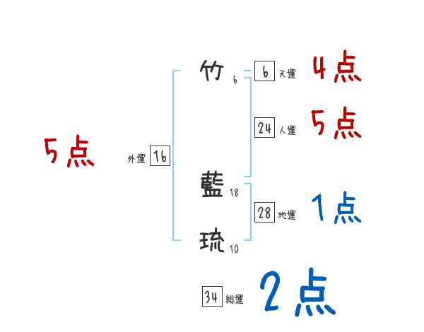 総運![]() | 竹藍琉さんの総運は34画の2つ星!独創性に優れるが、自尊心が強く災難に注意しましょう。 あなたの人生を表す1番重要な運勢です。生涯を通じて影響する総合運となり、主に50歳以降の晩年期に影響を及ぼします。 |