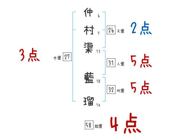 人運![]() | 仲村渠藍瑠さんの人運は31画の5つ星!社交性があり判断力に優れる。順風満帆な人生で円満な生活。 性格や才能などを表す2番目に重要な運勢です。人間関係や協調性、社会的な成功に影響します。主に20歳から50歳ぐらいまでの中年期の運勢を表します。 |