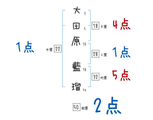 地運![]() | 大田原藍瑠さんの地運は32画の5つ星!柔軟性があり成功する。チャンスが多く金運が良い。 個性を表す基礎的な運勢です。性格形成や対人関係、行動力など家庭環境に影響されます。主に誕生してから20歳くらいまでの若年期の運勢を表します。 |