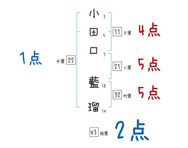 外運![]() | 小田口藍瑠さんの外運は22画の1つ星!努力することが苦手ないっぽう手先が器用。芸術性にも優れる。 生活面を象徴する運勢です。外部から受ける影響力を表し、結婚運、家庭運や職場、環境への順応性を表します。 |