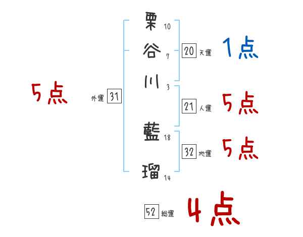 人運![]() | 栗谷川藍瑠さんの人運は21画の5つ星!統率力がある。独立し成功する。名誉を手に入れる。 性格や才能などを表す2番目に重要な運勢です。人間関係や協調性、社会的な成功に影響します。主に20歳から50歳ぐらいまでの中年期の運勢を表します。 |