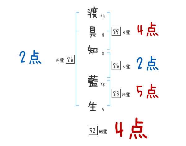 外運![]() | 渡具知藍生さんの外運は26画の2つ星!波瀾万丈かも。信頼できる人を大事にしましょう。 生活面を象徴する運勢です。外部から受ける影響力を表し、結婚運、家庭運や職場、環境への順応性を表します。 |