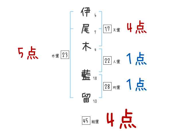 総運![]() | 伊尾木藍留さんの総運は45画の4つ星!もくもくと物事を進め達成する。地味な努力家。 あなたの人生を表す1番重要な運勢です。生涯を通じて影響する総合運となり、主に50歳以降の晩年期に影響を及ぼします。 |