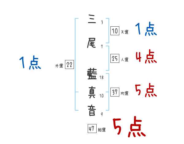 天運![]() | 三尾藍真音さんの天運は10画の1つ星!不安を感じやすい傾向。ストレスを抱えないように注意しましょう。 家系が持つ宿命的な運勢を表します。祖先から受け継いだ苗字ですので自分の力が及びません。家柄を象徴します。 |
