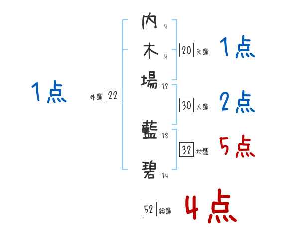 外運![]() | 内木場藍碧さんの外運は22画の1つ星!努力することが苦手ないっぽう手先が器用。芸術性にも優れる。 生活面を象徴する運勢です。外部から受ける影響力を表し、結婚運、家庭運や職場、環境への順応性を表します。 |