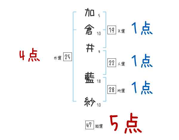 総運![]() | 加倉井藍紗さんの総運は47画の5つ星!実力が開花し発展する円満な人生。財に恵まれる。 あなたの人生を表す1番重要な運勢です。生涯を通じて影響する総合運となり、主に50歳以降の晩年期に影響を及ぼします。 |