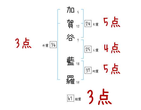 天運![]() | 加賀谷藍羅さんの天運は24画の5つ星!家庭運が良く順調な人生。金運にも恵まれる。 家系が持つ宿命的な運勢を表します。祖先から受け継いだ苗字ですので自分の力が及びません。家柄を象徴します。 |