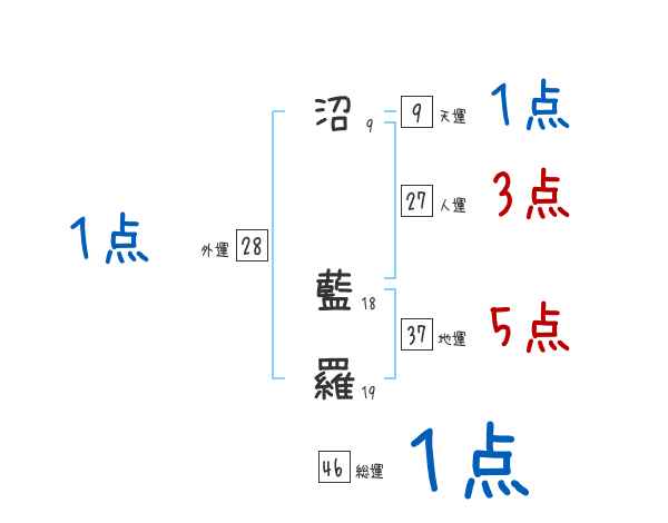 外運![]() | 沼藍羅さんの外運は28画の1つ星!家庭環境に注意。スポーツで活躍できる能力があるかも。 生活面を象徴する運勢です。外部から受ける影響力を表し、結婚運、家庭運や職場、環境への順応性を表します。 |