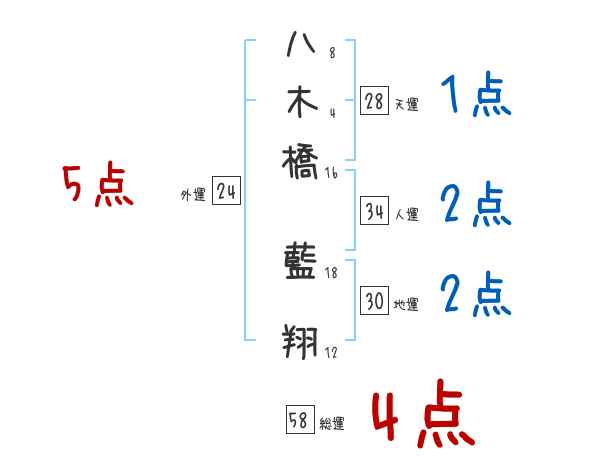 天運![]() | 八木橋藍翔さんの天運は28画の1つ星!家庭環境に注意。スポーツで活躍できる能力があるかも。 家系が持つ宿命的な運勢を表します。祖先から受け継いだ苗字ですので自分の力が及びません。家柄を象徴します。 |
