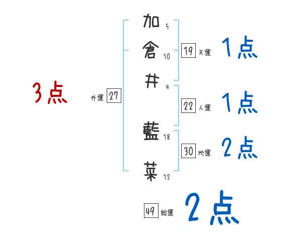 外運![]() | 加倉井藍菜さんの外運は27画の3つ星!頭脳明晰だが強情で摩擦が多い傾向。孤立に注意。 生活面を象徴する運勢です。外部から受ける影響力を表し、結婚運、家庭運や職場、環境への順応性を表します。 |