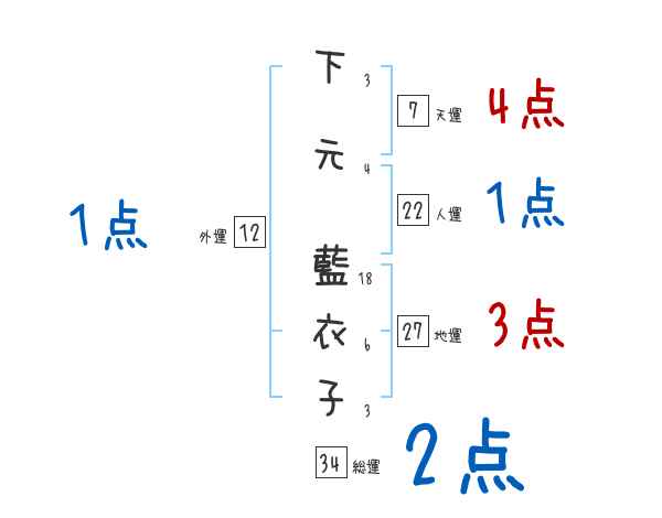 天運![]() | 下元藍衣子さんの天運は7画の4つ星!強い意志や信念を持ち独立心が強い。自立する。 家系が持つ宿命的な運勢を表します。祖先から受け継いだ苗字ですので自分の力が及びません。家柄を象徴します。 |