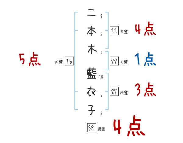 外運![]() | 二本木藍衣子さんの外運は16画の5つ星!人望が厚く大きく発展する。逆転成功が見える。 生活面を象徴する運勢です。外部から受ける影響力を表し、結婚運、家庭運や職場、環境への順応性を表します。 |