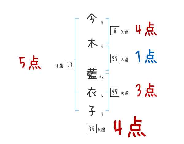 天運![]() | 今木藍衣子さんの天運は8画の4つ星!勤勉家。根気強く努力し成功する。忍耐力がある。 家系が持つ宿命的な運勢を表します。祖先から受け継いだ苗字ですので自分の力が及びません。家柄を象徴します。 |