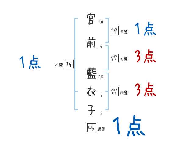 天運![]() | 宮前藍衣子さんの天運は19画の1つ星!優れた才能を持ちますが、協調性が足りないことも。周りの人と協力する事を意識しましょう。 家系が持つ宿命的な運勢を表します。祖先から受け継いだ苗字ですので自分の力が及びません。家柄を象徴します。 |