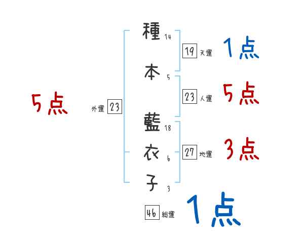 人運![]() | 種本藍衣子さんの人運は23画の5つ星!想像力に優れ活力がある。一代で成功し名誉を手に入れる。 性格や才能などを表す2番目に重要な運勢です。人間関係や協調性、社会的な成功に影響します。主に20歳から50歳ぐらいまでの中年期の運勢を表します。 |