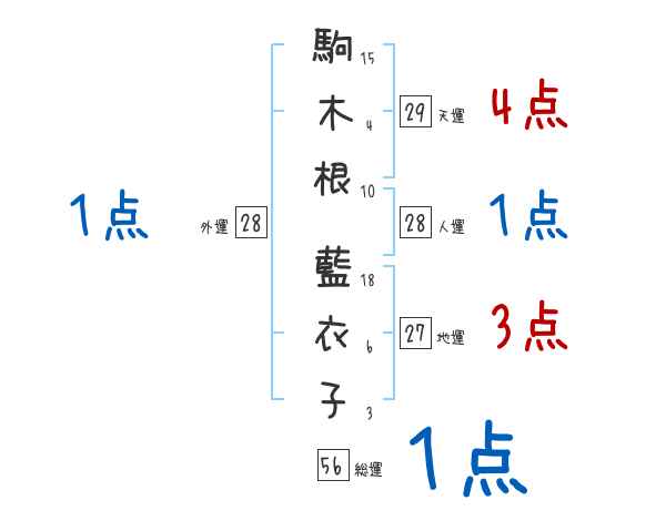 天運![]() | 駒木根藍衣子さんの天運は29画の4つ星!完全主義で才能がある。厳格な心の持ち主。 家系が持つ宿命的な運勢を表します。祖先から受け継いだ苗字ですので自分の力が及びません。家柄を象徴します。 |