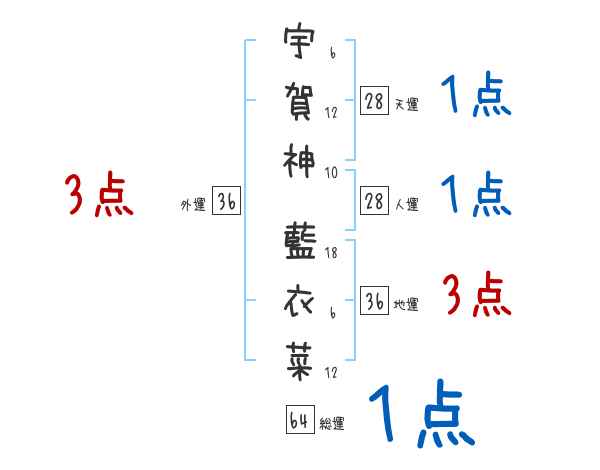 外運![]() | 宇賀神藍衣菜さんの外運は36画の3つ星!先見性が豊かです。多少神経質で苦労することも。 生活面を象徴する運勢です。外部から受ける影響力を表し、結婚運、家庭運や職場、環境への順応性を表します。 |
