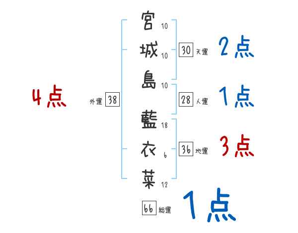天運![]() | 宮城島藍衣菜さんの天運は30画の2つ星!浮き沈みの激しさに注意しましょう。 家系が持つ宿命的な運勢を表します。祖先から受け継いだ苗字ですので自分の力が及びません。家柄を象徴します。 |