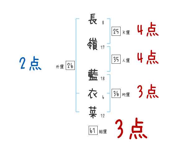 天運![]() | 長嶺藍衣菜さんの天運は25画の4つ星!個性があり才能があふれる。強運の持ち主で発展する。 家系が持つ宿命的な運勢を表します。祖先から受け継いだ苗字ですので自分の力が及びません。家柄を象徴します。 |