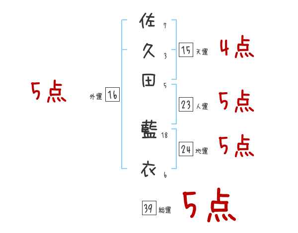 総運![]() | 佐久田藍衣さんの総運は39画の5つ星!社交性に優れ人望が厚い。人の上に立ち成功する。 あなたの人生を表す1番重要な運勢です。生涯を通じて影響する総合運となり、主に50歳以降の晩年期に影響を及ぼします。 |