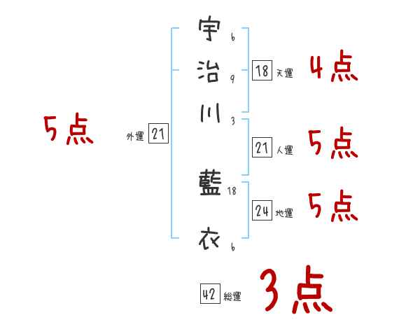 外運![]() | 宇治川藍衣さんの外運は21画の5つ星!統率力がある。独立し成功する。名誉を手に入れる。 生活面を象徴する運勢です。外部から受ける影響力を表し、結婚運、家庭運や職場、環境への順応性を表します。 |