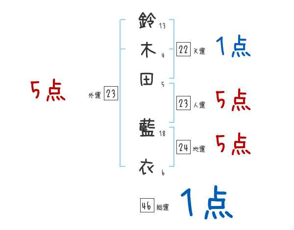 人運![]() | 鈴木田藍衣さんの人運は23画の5つ星!想像力に優れ活力がある。一代で成功し名誉を手に入れる。 性格や才能などを表す2番目に重要な運勢です。人間関係や協調性、社会的な成功に影響します。主に20歳から50歳ぐらいまでの中年期の運勢を表します。 |