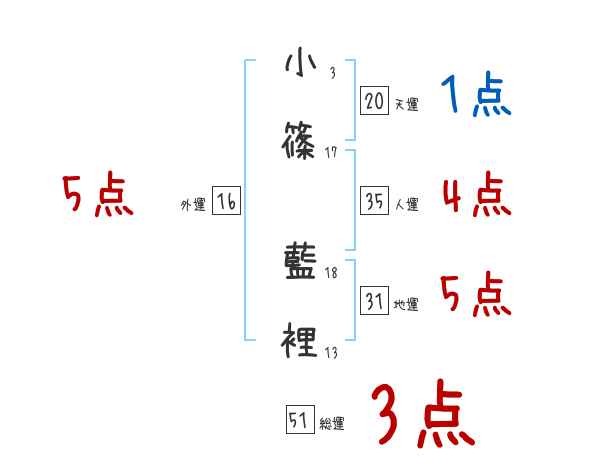 外運![]() | 小篠藍裡さんの外運は16画の5つ星!人望が厚く大きく発展する。逆転成功が見える。 生活面を象徴する運勢です。外部から受ける影響力を表し、結婚運、家庭運や職場、環境への順応性を表します。 |