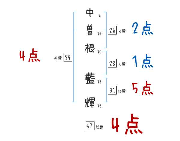 人運![]() | 中曽根藍輝さんの人運は28画の1つ星!家庭環境に注意。スポーツで活躍できる能力があるかも。 性格や才能などを表す2番目に重要な運勢です。人間関係や協調性、社会的な成功に影響します。主に20歳から50歳ぐらいまでの中年期の運勢を表します。 |