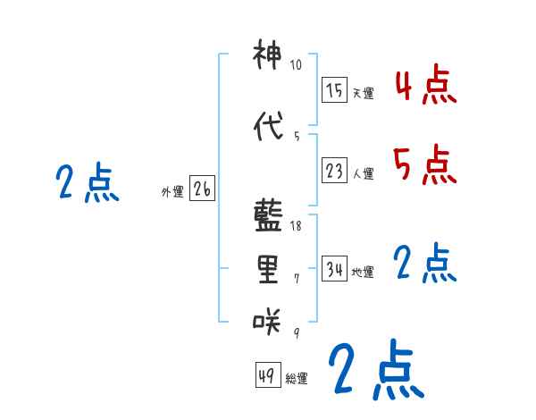 人運![]() | 神代藍里咲さんの人運は23画の5つ星!想像力に優れ活力がある。一代で成功し名誉を手に入れる。 性格や才能などを表す2番目に重要な運勢です。人間関係や協調性、社会的な成功に影響します。主に20歳から50歳ぐらいまでの中年期の運勢を表します。 |
